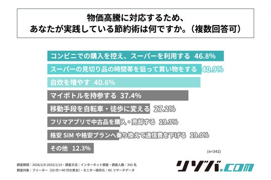 長引く物価高騰は、いまや日本社会全体の「関心事」であり、特に収入が不安定になりがちな層にとっては、日々の生活を直撃する深刻な問題となっています。同時に、働き方の多様化が進む現代において、フリーターを選ぶ人は一定程度存在しており、彼らの経済状況は社会的な注目を集めています。収入が不安定になりがちなフリーターの方々が、この厳しい経済状況下でどのような工夫を凝らし、日々の生活を維持しているのか、その実態は明らかになっていません。そこで、「リゾバ.com」は、フリーターの方を対象に「物価高騰下におけるフリーターのライフハック実態調査」を実施しました。