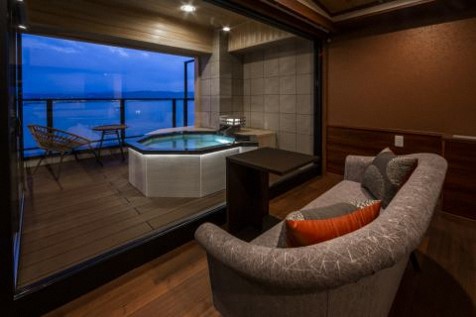 美しい夕景をイメージして作られた5つのお部屋は、すべて異なるデザインです。もちろん、お部屋の温泉も宍道湖湖畔に湧く天然温泉を使用しており、宍道湖の景色を一望できます。誰にも邪魔されない非日常空間で大切な人とのんびりお過ごしいただけます。