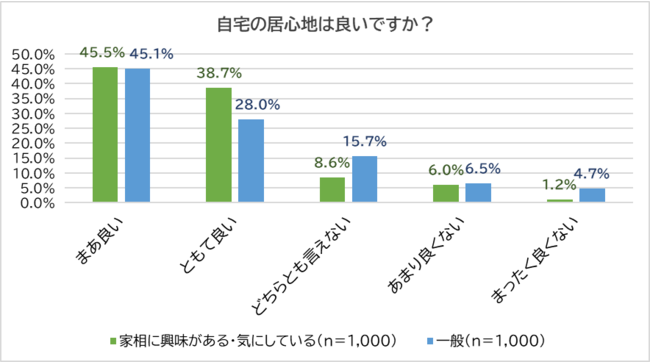 次に、「自宅の居心地」について尋ねました。「まあ良い」(家相:45.5%、一般:45.1%)ならびに「とても良い」(家相:38.7%、一般:28.0%)と感じている人が8割前後おり、多くの人が心も体も安らげる家に住んでいることがわかりました。