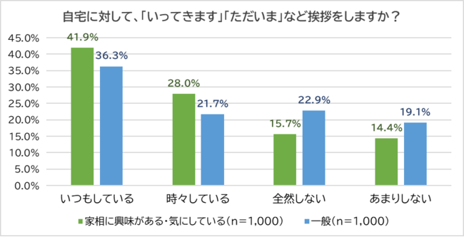 最後に、「自宅に対して、出かける時に『いってきます』、帰ってきたら『ただいま』など挨拶をするか」尋ねました。「いつもしている」(家相:41.9%、一般:36.3%)が最多で、「時々している」(家相:28.0%、一般:21.7%)も次に多いことからも、半数以上の人が日常的に自宅に挨拶をしていました。意識的に「いってきます」「ただいま」と挨拶する人がいる一方、自宅に家族がいるかいないかに関わらず、小さい頃からの習慣で挨拶する人も多いのではないでしょうか。