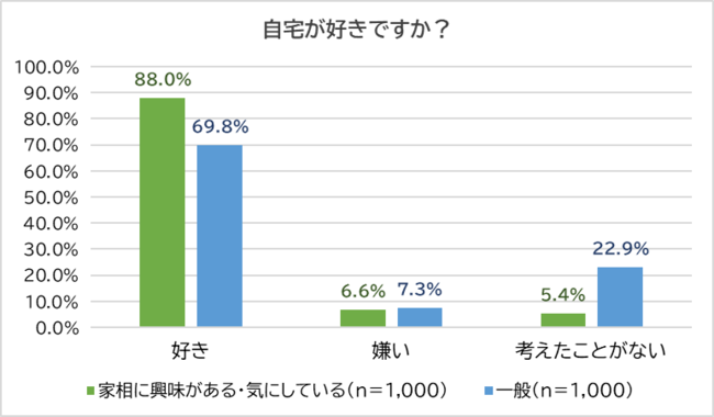 「自宅が好きか」尋ねたところ、「好き」(家相:88.0%、一般:69.8%)、「考えたことがない」(家相:5.4%、一般:22.9%)、「嫌い」(家相:6.6%、一般:7.3%)となりました。