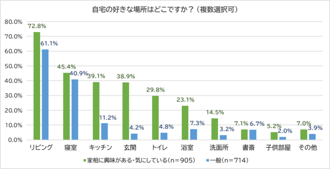 「自宅で好きな場所はあるか」尋ね、「ある」(家相:91.0%、一般:71.4%)と回答した人に、「どこが好きか」尋ねたところ、「リビング」(家相:72.8%、一般:61.1%)、「寝室」(家相:45.4%、一般:40.9%)、「キッチン」(家相:39.1%、一般:11.2%)、「玄関」(家相:28.9%、一般:4.2%)、「トイレ」(家相:29.8%、一般:4.8%)となり、キッチン、玄関、トイレは、家相と一般で乖離がありました。