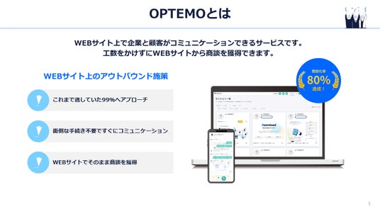 OPTEMO(オプテモ)は、Webサイトへ訪問したお客様とWebサイト上でそのままコミュニケーションができるセールステックSaaSです。既存のWebサイトに専用のタグを1行入れることですぐに導入が可能であり、「これまで知らずに逃していたお客様」との顧客接点を取ることが可能になります。