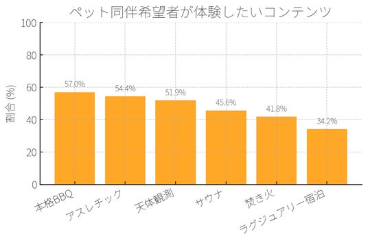 ペットと一緒にグランピングに行きたい人が特に体験したいコンテンツとしては、「本格BBQ」(57.0%)がトップで、次いで「アスレチック・アクティビティ」(54.4%)、「天体観測」(51.9%)、「サウナ体験」(45.6%)、「焚き火体験」(41.8%)、「ラグジュアリーな宿泊体験」(34.2%)となっています。