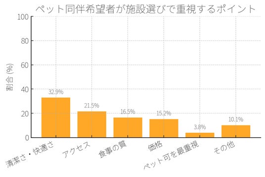 ペット同伴希望者が最も重視するのは「施設の清潔さ・快適さ」で32.9%、次いで「アクセスの良さ」(21.5%)、「食事の質・バーベキュー体験」(16.5%)、「価格」(15.2%)という結果になりました。「ペット同伴可であること」そのものを最重視すると答えた人は3.8%でした。