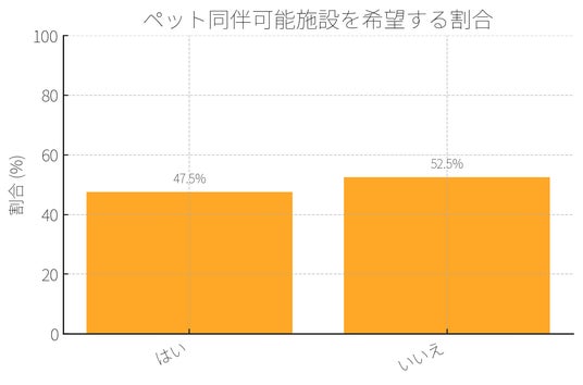 さらに「ペット(犬・猫など)と一緒に宿泊できるグランピング施設を希望しますか?」という質問(Q3)では、「はい」と回答した人が47.5%と約半数となりました。これは全回答者に対する割合ですが、実際に回答を寄せた人の中では62.5%が「はい」と答えています。この結果は、直接ペットと行きたいと考えていない層も含めて、ペット同伴可能な施設へのニーズが高いことを示しています。