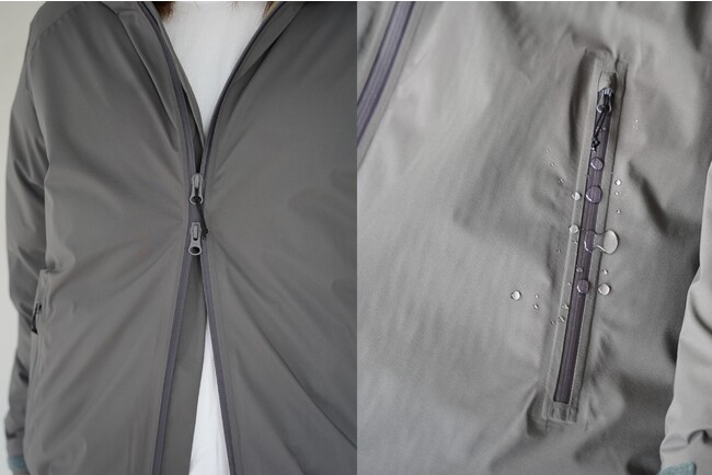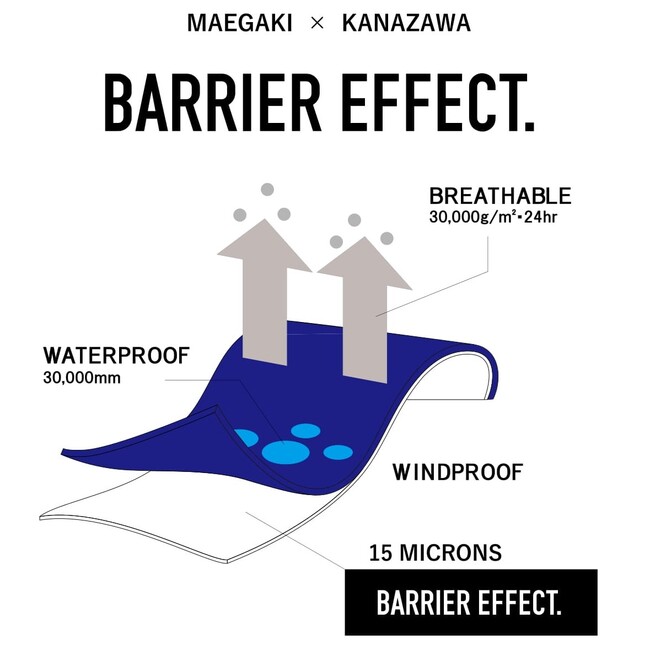 限りなく薄く延ばされた防水透湿膜はわずか15ミクロンの極薄メンブレンを使用、豪雨に耐える高い耐水圧30,000mm以上※¹を有し、同時に内側の湿気を外側に排出する優れた透湿性30,000g/平方メートル /24hr以上※²と、最先端の高機能レインウェアにも匹敵するスペックを備えています。外側からの雨を防ぎつつ、身体からの汗による湿気は衣服の外に逃がすことができるため、常に衣服内はサラサラで快適を保ってくれます。