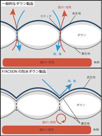 今回はダウンウェア用という事で通常F/ACSIONのレインウェアに使用している3層構造の素材を、軽さとストレッチ性を重視し特別に専用の2層構造素材を使用しております。