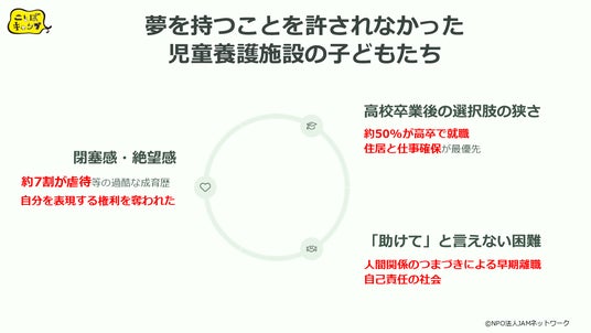 児童養護施設で暮らす子どもは基本的に高校卒業時に退所をしますが、家族からの経済的・精神的支援がないまま自立を迫られ、進路選択と社会への適応という重大な岐路に立ちます。約7割が虐待経験を持ち、自己肯定感が低い彼らは、就職後も対人関係のつまずきから早期離職するリスクが高く、貧困の連鎖に陥りやすい現状があります。「ドリームナビゲーター」プログラムは、「言語化」による自己表現力の向上、調理実習などの「実践」を通じたチームワークの体験、多様な「ロールモデル」との対話という3つのアプローチを組み合わせた総合的かつ実践的な支援プログラムです。これにより、子どもたちは自分の可能性を見出し、社会で必要とされる対人スキルを身につけ、困難に直面しても前向きに未来を切り拓く力を育みます。