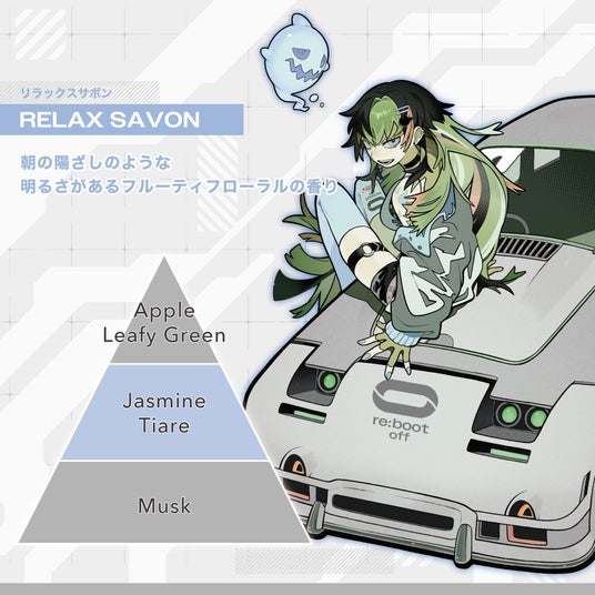 2023年春に発売した「リブート」は人気イラストレーター「WOOMA」さんが描き下ろしたイラストを起用した自動車用消臭芳香剤でです。