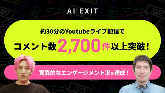 株式会社FLATBOYS(本社:東京都目黒区、代表取締役:内田遼)は、吉本興業所属のお笑い芸人 EXITをAIアバター化した「AI EXIT」にてYouTubeライブ配信を実施し、約30分の配信でコメント数2,700件以上を記録するなど、AIアバターのみの稼働(タレント本人の稼働なし)で驚異的なエンゲージメント率を達成しました。