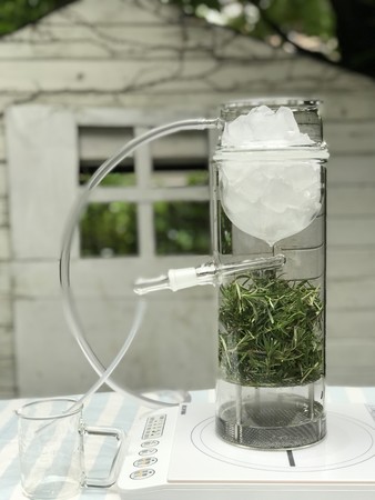 ヨモギ、柚子、ローズ、ローズマリー、月桃、ショウガなど季節によって様々な植物を蒸留。自家用蒸留器はガラス製で蒸留の過程がよくわかります。