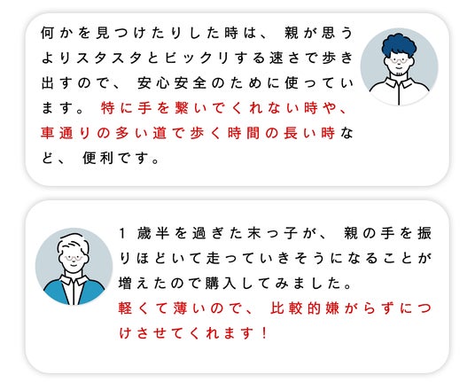 お子さまが予期せず走り出したり、危険な場所に行かないように対策ができます。特に交通量の多い場所や混雑した駐車場、ショッピングセンター、遊園地、イベント会場などで役立ちます。