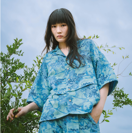 今回、新たに備後産地の工場とコラボレーションのコレクションを作りました。POLS独自の播州ジャカード織に使うプログラムデータを、デニム産地の織機に使用することで、播州織産地と、備後デニム産地の要素が加わったインディゴ染めのジャカード織の開発に成功しました。また、デニム産地が得意としている製品加工の技術を使い、デニムの色落とし加工を施しました。