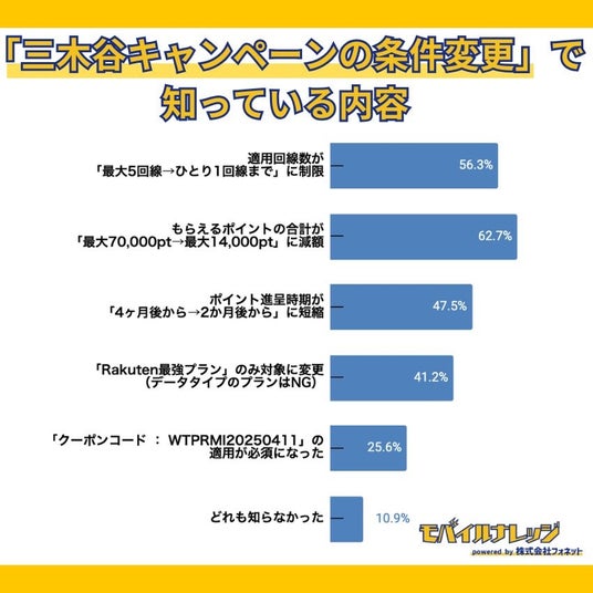 株式会社フォネットが運営するメディア「モバイルナレッジ」にて、「楽天モバイルの三木谷キャンペーンの条件変更」に関するアンケート調査を実施しました。
