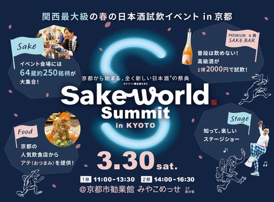 Sake World Summit in KYOTO実行委員会は、2024年3月30日(土)に京都・岡崎にある京都市勧業館[みやこめっせ]にて、関西最大級の日本酒の祭典「Sake World Summit in KYOTO」を開催。参加酒蔵全65蔵(社)が決定しましたので、お知らせいたします。