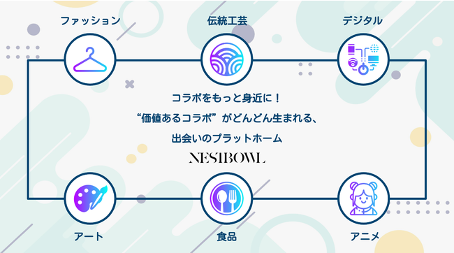 NESTBOWL株式会社(本社:東京都港区、代表取締役:池松孝志)は、2022年4月13日(水)、企業間コラボレーションに特化した初の「コラボ・マッチングプラットフォーム」のサービスを開始します。同プラットフォームでは、ファッションやアクセサリーに限らず、デジタル、音楽、アート、伝統工芸、漫画、アニメ、その他IP(知的財産)など含めて新しいライフスタイルやカルチャーを創造するために、幅広い企業間コラボレーションを促進する“新しい企業が出会うためのプラットフォーム”です。NESTBOWLが持つライフスタイル感度の高い企業ネットワークを中心とした、高付加価値提案型のマッチングプラットフォームとなります。