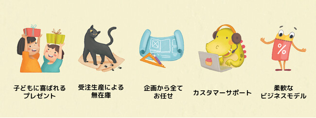 当社はこれからも、主に子どもが好きなテーマ(乗り物・生き物・キャラクター、等)で他社との共創に取り組んでいく予定です。保有するアセットを活かして、子どもに喜ばれるオリジナルのパーソナライズ絵本を出版しませんか?