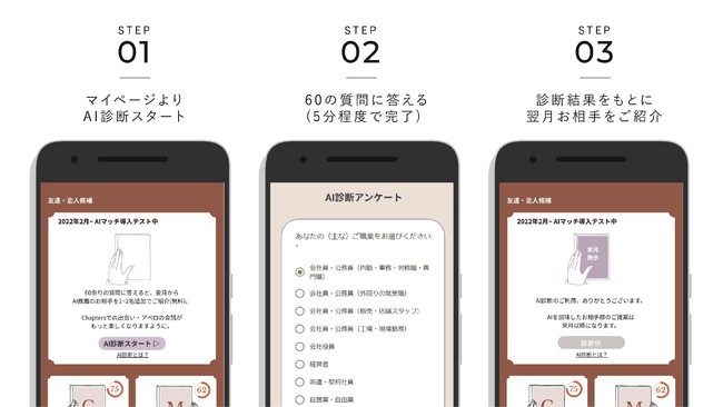 CCCマーケティングが開発したAIマッチングは、これまで地方自治体の婚活事業などで導入実績があり、マッチング率や満足度において一定以上の効果※1を示しております。今回、本の好みや属性をもとに相性の良いお相手をご紹介するチャプターズの機能・リクエストアペロに、AIマッチングを組み合わせることで、チャプターズでの出会いがユーザーにとってより魅力的に感じていただけるか、様々な角度から検証してまいります。