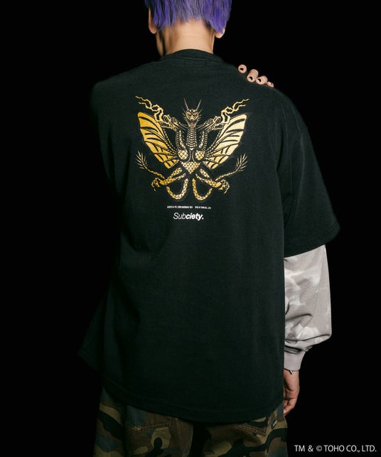 フロントには1996年に公開された『モスラ』のポスターグラフィックをブラックマジック風プリントで施しました。バックネックにはゴジラフォントに落とし込まれた「サブサエティ」のコラボロゴをプリントでオン。