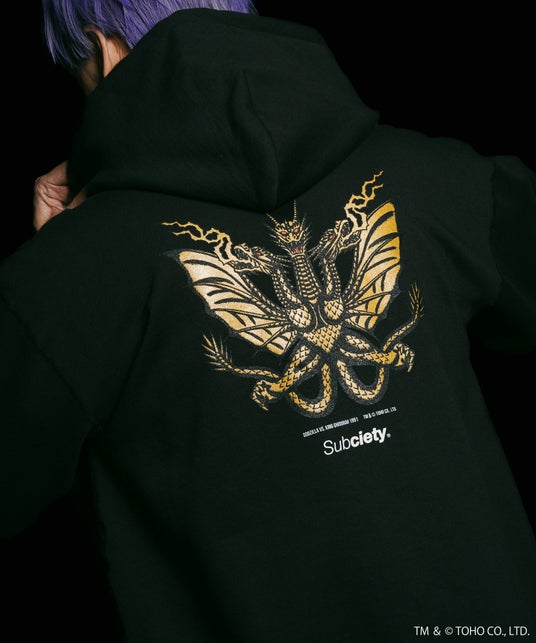 フロントにはオールドイングリッシュの「KING GHIDORAH」ロゴを、バックには1991年に公開された『ゴジラVSキングギドラ』からインスピレーションを受け、アメリカントラディショナルテイストに描き下ろしたキングギドラをプリントで施しました。
