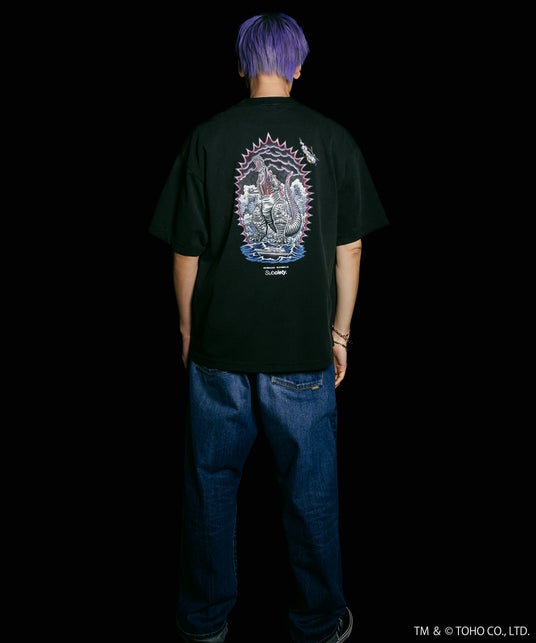 フロントには1984年に公開された『ゴジラ』のポスターグラフィックをブラックマジック風にプリントで施しました。バックネックにはゴジラフォントに落とし込まれた「サブサエティ」のロゴをプリントでオン。
