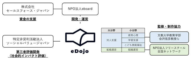 eDojoは、株式会社セールスフォース・ジャパンの支援を受け、eラーニングと現場でのグループワークを組み合わせたハイブリッド型の研修プログラムとして開発。プログラム内の講座は、対人支援のための教育心理、学習支援、こども家庭福祉の3分野、フリースクール等民間団体の運営のための組織運営分野の計4分野で、構成されています。対人支援分野については、文教大学教育学部・会沢信彦教授をはじめとした各分野専門家の監修を、組織運営分野については、フリースクール全国ネットワークの協力の下、制作を進めました。
