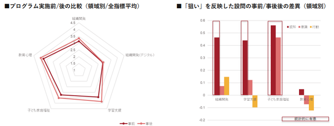 受講者へのアンケートから、スキル分野別にeDojo受講前後の比較をした結果、5領域のうちeDojoを受講した4領域すべてにおいて、プラスの変化が見られました。「認知→意識→行動」の変容プロセス別で見ると、変容に時間を要する「行動」については、統計的に有意な差が見られなかったものの、「学習支援」「子ども家庭福祉」を中心に確かな変化が見られ、講義内容についての理解や意識の変容が進んでいることが、確認されました。