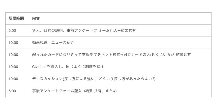 具体的な流れとしては、受講者はカードに書かれた架空の人物になりきり、カードの状況で利用できる公的支援制度を探す。その後、通常のインターネット検索とCivichatの利用の双方を体験する。