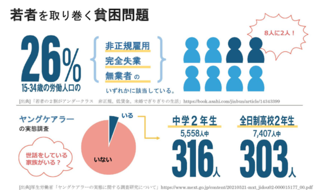 中でも若者を取り巻く貧困問題は大変深刻であり、15-34歳の労働人口の26%(4人に1人)が非正規雇用・完全失業・無業者のいずれかに属しているほか、学生でありながら家族の世話をせざるを得ない「ヤングケアラー」なども問題視されています。
