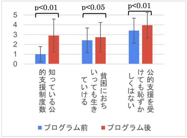 「防窮訓練」前後での、知っている公支援制度数や貧困・制度に対する認識(5 件法)の変化を図2に示した。対応のある t 検定において、いずれも5%水準で有意 な改善が見られた(N=64、有効回答率 92.8%)。