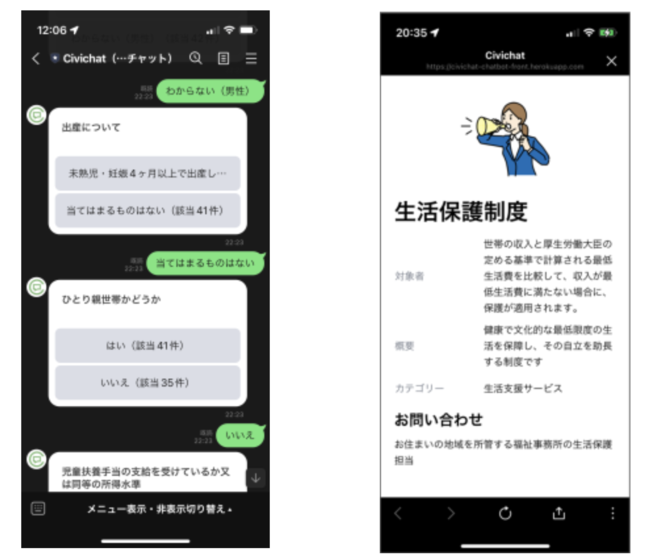 Civichatは、LINEなどからチャットボット形式で自分の状況を入力することで、利用できる制度を推薦してくれる。