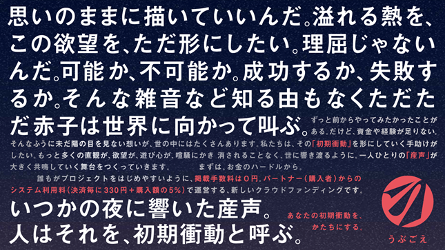 あなたの初期衝動を、かたちにする。業界初の手数料システムクラウドファンディングサービス「うぶごえ」