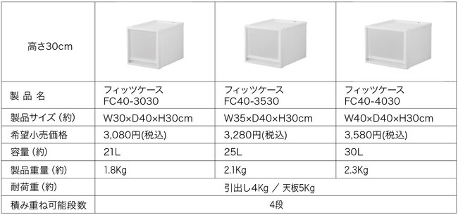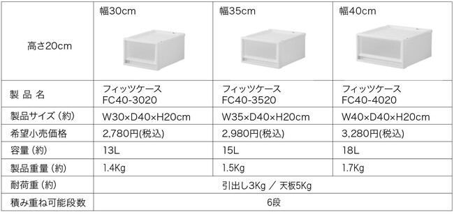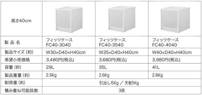 フィッツシリーズは1986年の発売より様々な住宅環境や用途に合わせて、皆様の生活にフィットする収納用品を提案してまいりました。新モデルの「FC40」シリーズは近年の住宅デザインや住空間、ライフスタイルの多様化に合わせて開発された、使用シーンを選ばない奥行40cmの引出し収納ケースです。
