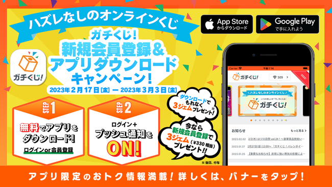 株式会社ピットアース(本社:江東区有明)のハズレなしのオンラインくじサービス『ガチくじ!』(URL:https://gachi-kuji.jp/)では、来る2/17(金)12時~『ガチくじ!』公式アプリのリリースを記念して『ガチくじ!アプリダウンロードキャンペーン』、『ガチくじ!祝2周年キャンペーン』を同時開催します!
