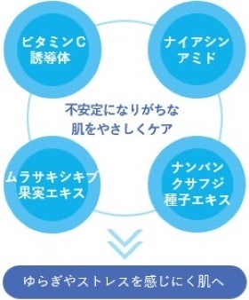 ゆらぎやストレスを感じる肌を整えてくれるナイアシンアミドやビタミンC誘導体・ムラサキシキブ果実エキス・ナンバンクサフジ種子エキスを配合。(すべて皮膚コンディショニング成分)