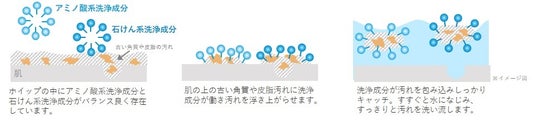 泡立ていらずのポンプ式で、自分で泡立てたような軽やかでなめらかな泡が瞬時にでき、朝晩いつでも手軽に摩擦レスで洗顔ができます。また、肌に近い成分でやさしく洗うアミノ酸系洗浄成分と、余分な皮脂や古い角質などをしっかり洗い流せる石けん系洗浄成分を独自の配合比でブレンド。さっと洗い流しながら、つっぱりも感じない肌へのやさしさと洗浄力を同時に叶え、心地よい素肌へ導きます。