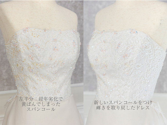 スペシャリストによる丁寧な保管を心がけていても、装飾品の経年劣化を防ぐことは大変難しいことです。しかし、すぐさま廃棄してしまうのではなく、変色してしまったスパンコールの総取り替えを行うことで、まるで新品のような輝きをドレスが取り戻します。今まで和装のメンテナンス・リペアを行なってまいりましたが、本年7月より、主に洋装衣裳装飾品への自社内リペアにつきましても開始いたしました。