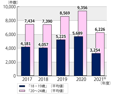 (※3)2020年度同期件数(2021年1月末までのPIO-NET登録分)は、「18・19歳」(平均値)が4,489件、「20~24歳」(平均値)が7,069件。