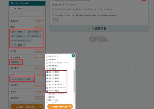 これまでバス乗務員としていた職種検索軸を『高速バス乗務員』『観光バス乗務員』『路線バス乗務員』『送迎バス乗務員』に職種を細分化。タクシードライバーについては、2024年4月から開始された『ライドシェアドライバー』の職種検索軸を追加し、『配車アプリの導入』の有無を新たに検索軸として加えました。
