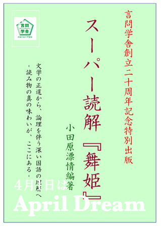 1点目は、森鷗外の名作『舞姫』を、高校生のみなさんに深く読みこんでもらい、もって小説などの文学作品だけでなく、論説文の論理的読解力の向上をも図る「スーパー読解『舞姫』」です。鴎外の『舞姫』原文に加え、言問学舎の小田原漂情による全文現代語訳を掲載し、全文の音読DVDもついていますから、現在の高校生にも、『舞姫』に親しんでもらうことができます。