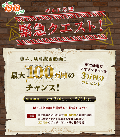 今回は、当社運営(ギルド)からの緊急クエストということで、以下のような最大100万円分の報奨金をゲットできるキャンペーンを実施いたします。また、参加するだけでアマゾンギフト3万円分が当たるWチャンスも実施いたします。「そちまる」のファンの方、これからファンになる方、初めて知った方、ご参加をお待ちしております。