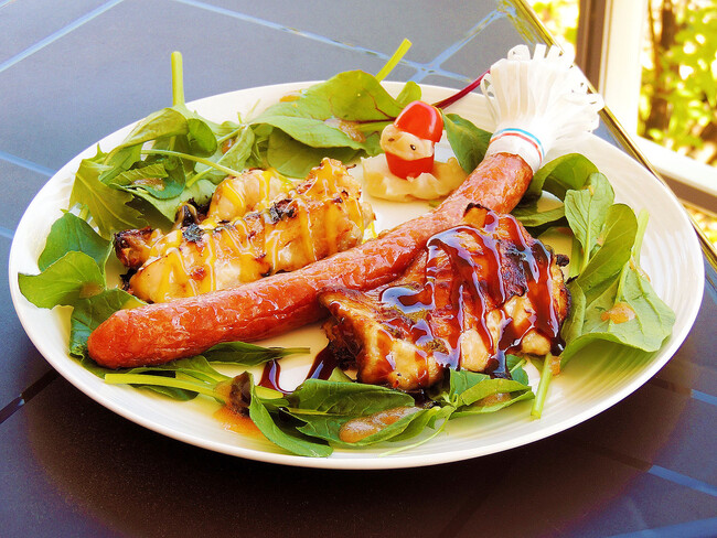 ベビーリーフをクリスマスリーフに見立てた飾りと、チキングリルのバルサミコソースとレモンジンジャーソースにブルストソーセージ。マッシュポテトとミニトマトのサンタさんを飾りました。販売価格 税込 1,700円