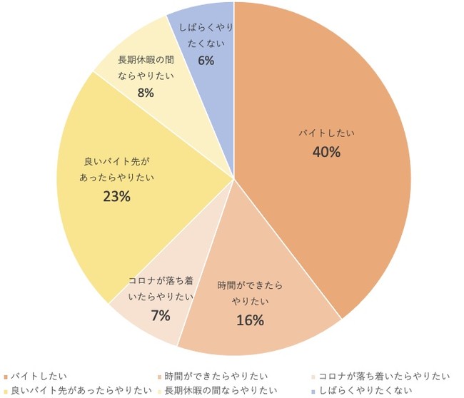 また、Q1回答方に対して、「Q2.今後アルバイトをやりたいですか?」(n=96)と質問したところ、「バイトしたい」が40%、そのほか条件がありつつも今後バイトをしたいと回答した方が54%であった。