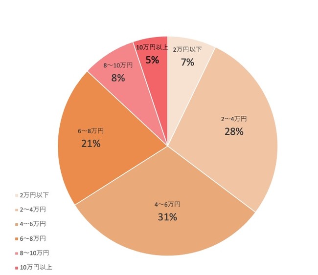 同様に「Q6.アルバイトの月収はどれくらいですか?」(n=391)と質問したところ、一番多く集まった回答は「4~6万円」(31%)であった。次いで「2~4万円」が28%、「6~8万円」が21%である。