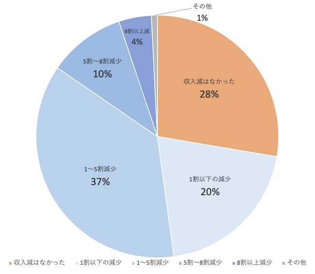 「Q12.具体的にどのくらい収入は減りましたか?」(n=467)という質問に対しては、「収入減はなかった」が28%、「1割以下の減少」が20%、「1~5割減少」が37%、「5~8割減少」が10%となった。