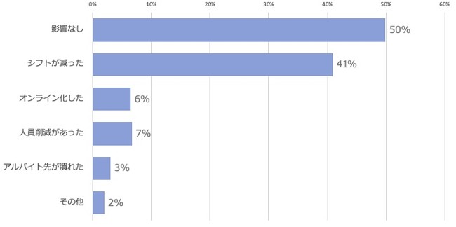 「Q11.あなたのアルバイトに新型コロナの影響はありましたか?」(n=467)と質問したところ、意外にも「影響がない」と回答した方が50%だった。影響があったと回答した方のうち、一番多い意見は「シフトが減ったこと」だった。