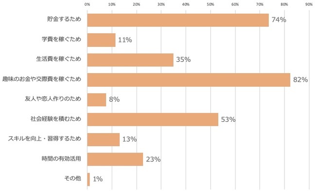 「Q7.アルバイトをする(していた)目的はなんですか?」(n=467)と複数回答有りで質問したところ、「趣味のお金や交際費を稼ぐため」という回答が一番多くの割合を占めた。2番目に多い回答となったのは「貯金をするため」であった。