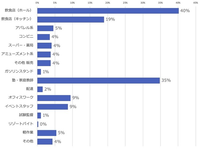 現在アルバイトをしていると回答した方に対して、「Q4.現在どんなアルバイトをしていますか?」(n=391)と質問したところ、「飲食店」や「塾・家庭教師」の割合が高いことがわかった。