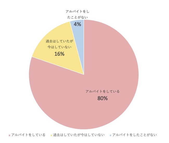 大学生の多くはアルバイト経験があり、一切アルバイトをしたことがない人は全体の4%であった。